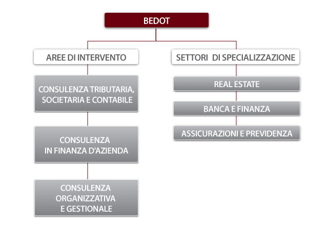 BEDOT ASSOCIATI, allo scopo di rendere il più possibile trasparente alla clientela il proprio perimetro di manovra e le attività che può garantire con elevato grado di professionalità, sempre nel rispetto di quanto previsto dal decreto legislativo n. 139/2005 in materia di attività oggetto della professione di dottore commercialista, ha individuato le proprie aree di intervento e i propri settori di specializzazione.